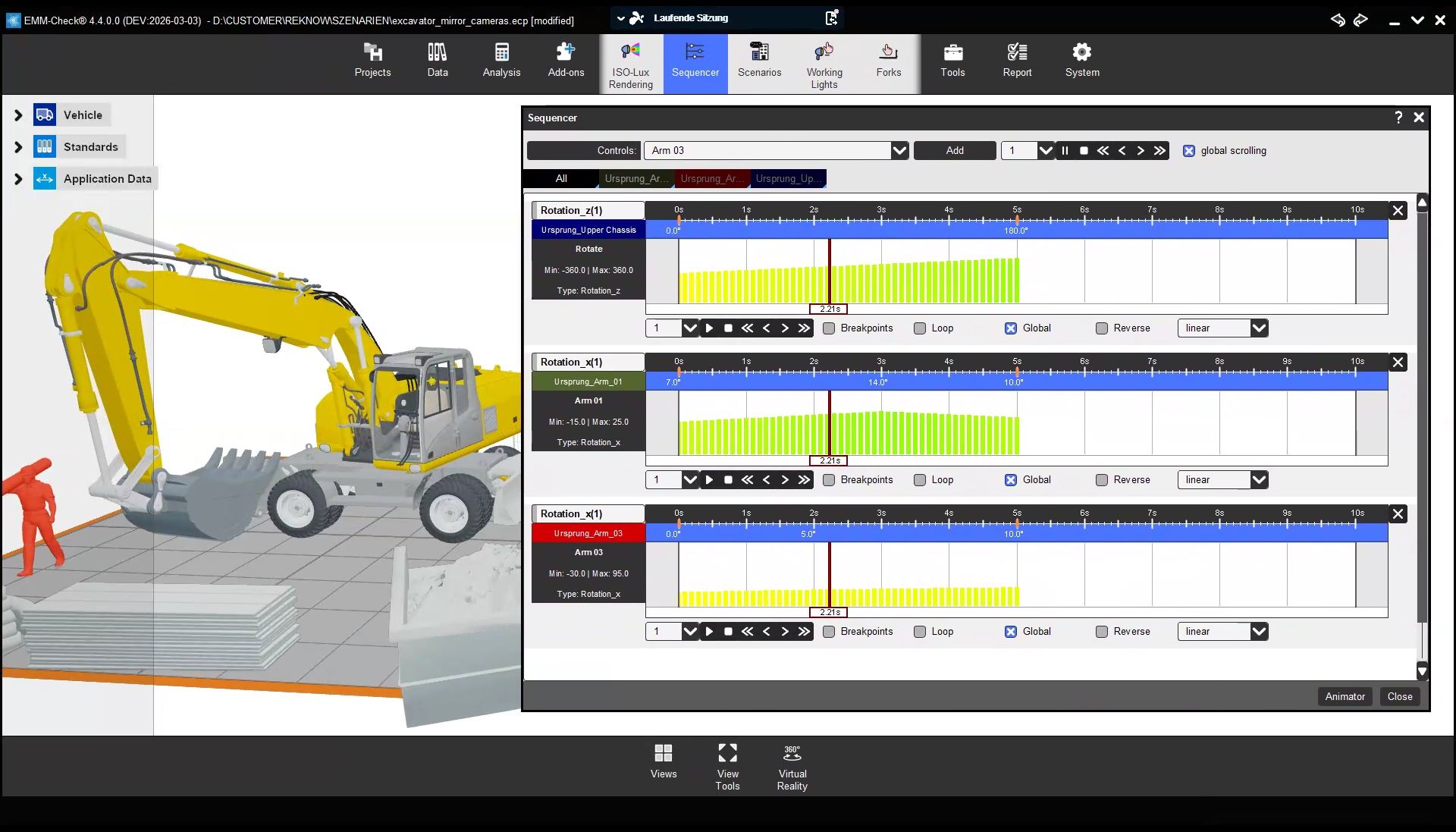 Der Sequencer ermöglicht die Animation von Fahrzeugen auf Basis von Steuerelementen, deren Werte in Bezug zu einer Zeitleiste festgelegt werden. Somit lassen sich reproduzierbare Abfolgen von Bewegungen von Fahrzeugen realisieren.