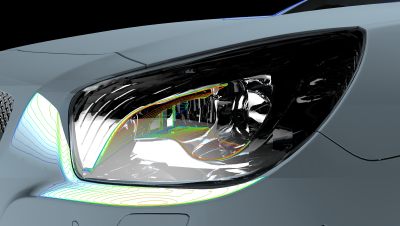 Das ISO-Lux Rendering simuliert die Lichtverteilung auf der Fahrzeuggeometrie. So lässt sich beispielsweise ermitteln, ob die Sicht des Fahrzeugführers durch Lichtstreuung oder Reflexion direkt oder indirekt beeinträchtigt wird und Monitore oder Geräteanzeigen nicht mehr oder nur schlecht wahrgenommen werden. - ISO-Lux-Ansichten basieren auf den durch die Hersteller ermittelten realen Messdaten der Arbeitsscheinwerfer