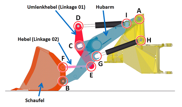 Hinweis: Die verwendeten Regeln bilden die Z-Kinematik hinreichend genau ab. Es können aber ggf. kleinere Positionsabweichungen zwischen dem Hebel und der Schaufel an Position "F" auftreten.