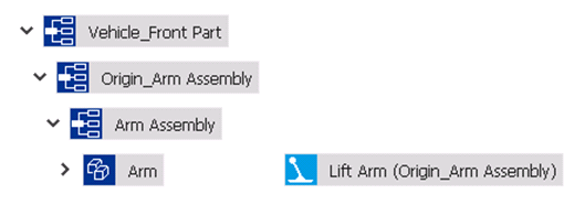 - Verschieben der Komponente "Bucket Assembly" in die neue Komponente "Linkage Assembly - direct rotation" (Funktion: Bearbeiten / Knoten verschieben)