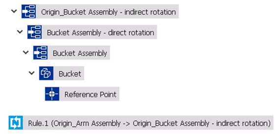 - Erzeugen einer Regel auf der Komponente auf der Komponente "Origin_Arm Assembly" zur Steuerung der Komponente "Origin_Bucket Assembly - indirect rotation" (Faktoren alle auf 0, nur Rotation um X auf -1) (Funktion: Hinzufügen / Regel)